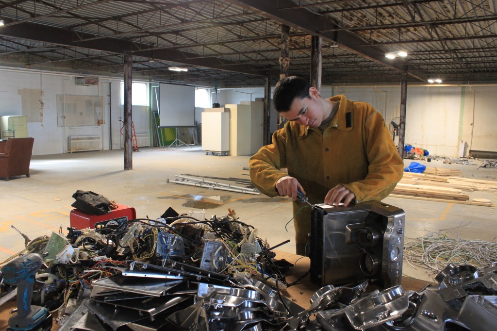 Through the use of these materials, I construct sculptures that blur boundaries between the biological and the industrial, the discarded and the futuristic, honouring the histories embedded in urban objects while reactivating them within new narratives. My process involves collecting residual parts and matter from salvage depots, automobile garages, small businesses, donation streams, and the street. I seek out elements with resonant qualities, shared colour, texture, or form that can be assembled into cohesive, complex structures. Amongst this miscellany are scrap car parts, retired bicycles, kitchen appliances like fans and coffee machines, electronics, wires, light fixtures and anything that is often considered junk.